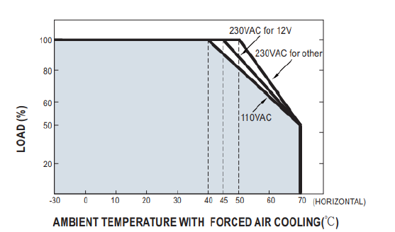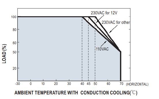 自然對流冷卻是消散電源運轉(zhuǎn)過程中產(chǎn)生之熱能的最便捷方式,由于沒有使用風扇,因此不會發(fā)出吵人的噪音,同時電源內(nèi)部也不會有灰塵被吹入。根據(jù)圖四的降載曲線,該解決方案適用于額定功率低于60-70%的負載,為了使氣流在設(shè)備中確實流通,應注意其上方的間隙距離要有10cm,對于更高的功率需求,強制風冷和傳導冷卻則較為合適。